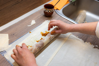 Take one pastry sheet, brush it with a thin layer of oil and add another sheet on top. Add roughly 4 tbsp of potato mixture and roll up. Repeat this until the mixture is used up, and place them on a baking tray arranged into a circular shape. Brush the top with oil and bake for 20-30 minutes at 200°C.
