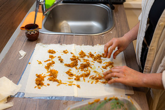 Lay the pastry sheets flat on the table and put some oil in a container. Sprinkle some of the oil over the sheet and spread a small amount of the pumpkin mixture over the pastry sheets (roughly divide the mixture by the number of sheets you have). Roll up and arrange into a baking try.